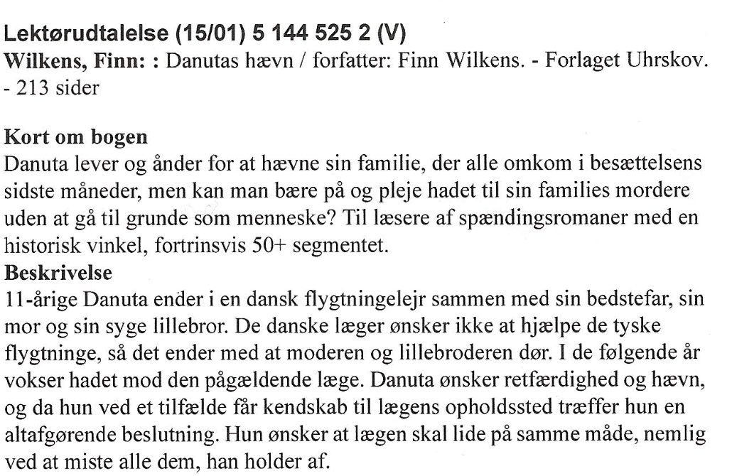 Skal danske læger hjælpe tyske flygtninge i Danmark, når tyskerne ikke vil frigive deres kolleger i kz-lejrene? Den 11-årige Danuta flygter for russerne med sin familie til Danmark i foråret 1945. Her mister hun sin bror og mor, og denne sorg udvikler sig til had og hævn mod den læge, der nægtede dem hjælp.I 1967 er hun 33 år og parat til at føre hævnen ud i livet.